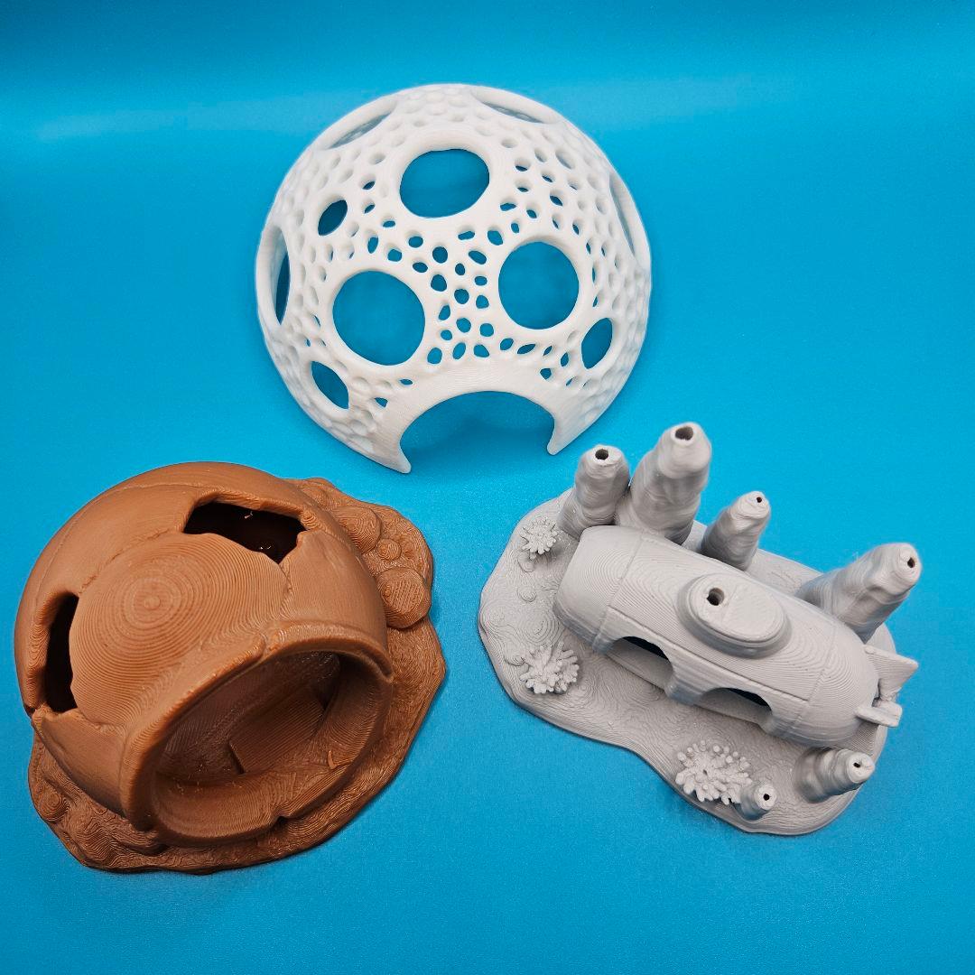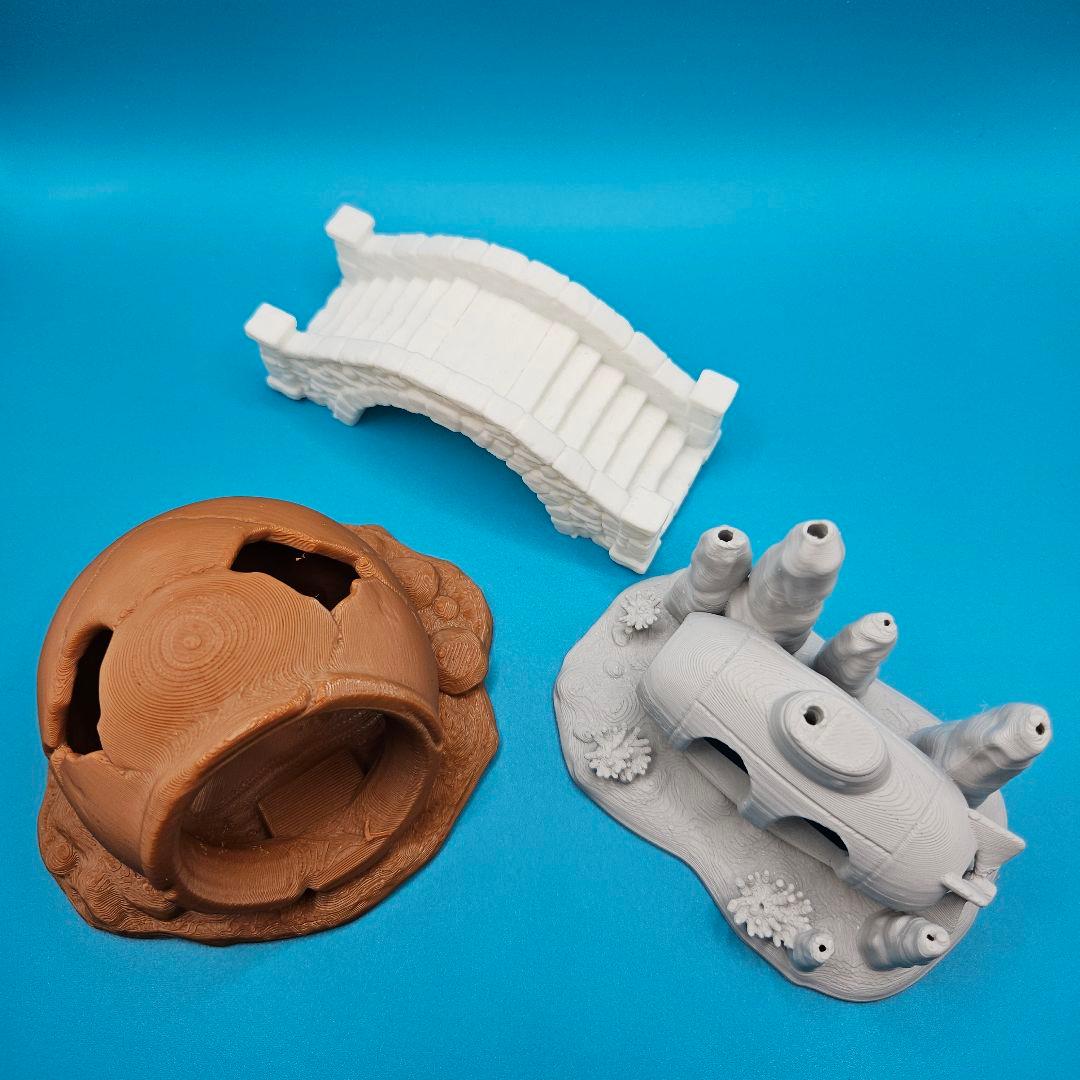 水槽用オーナメントの3点セットです。3Dプリントで製作しており、生体の隠れ家や美しい水草レイアウトの土台として幅広く活躍します。