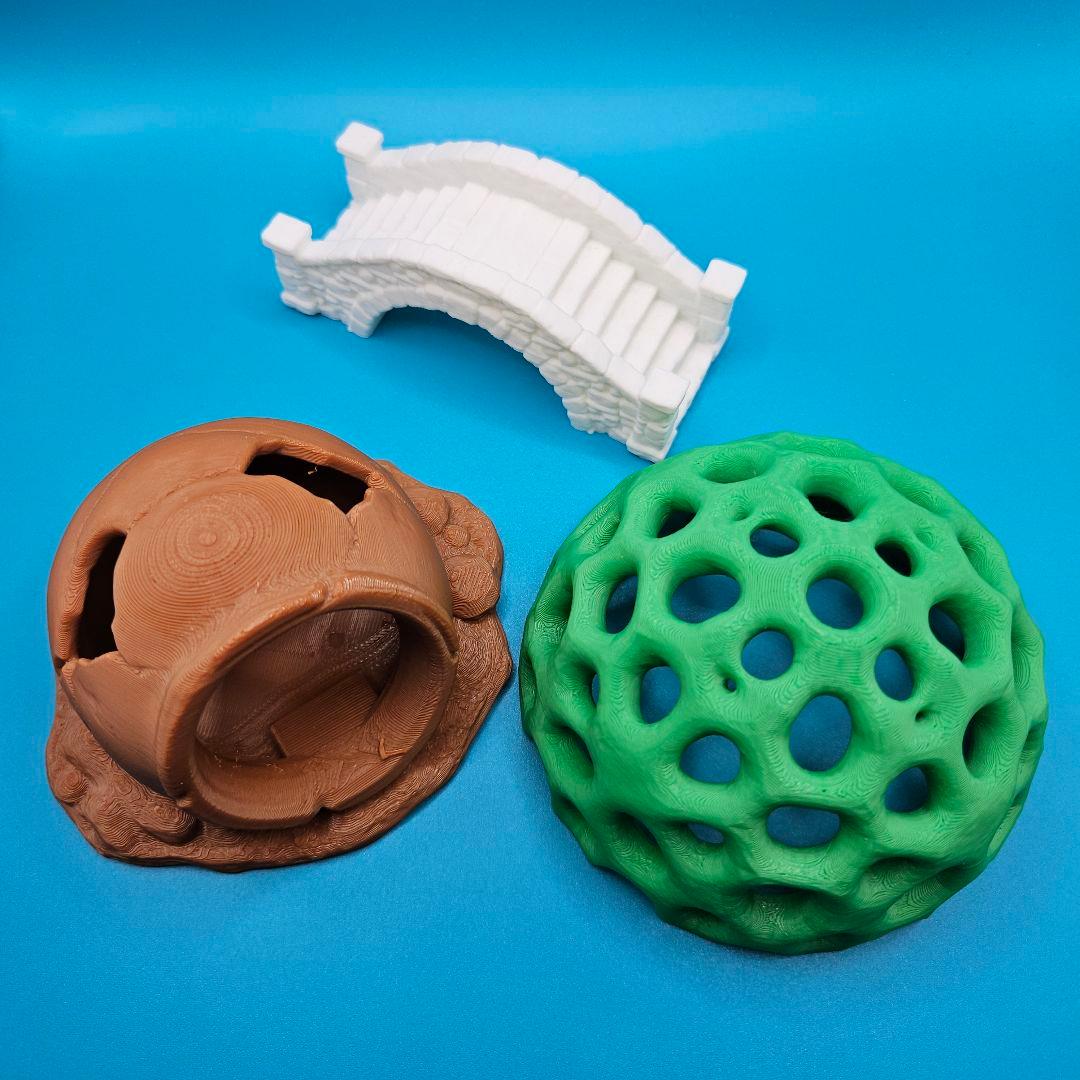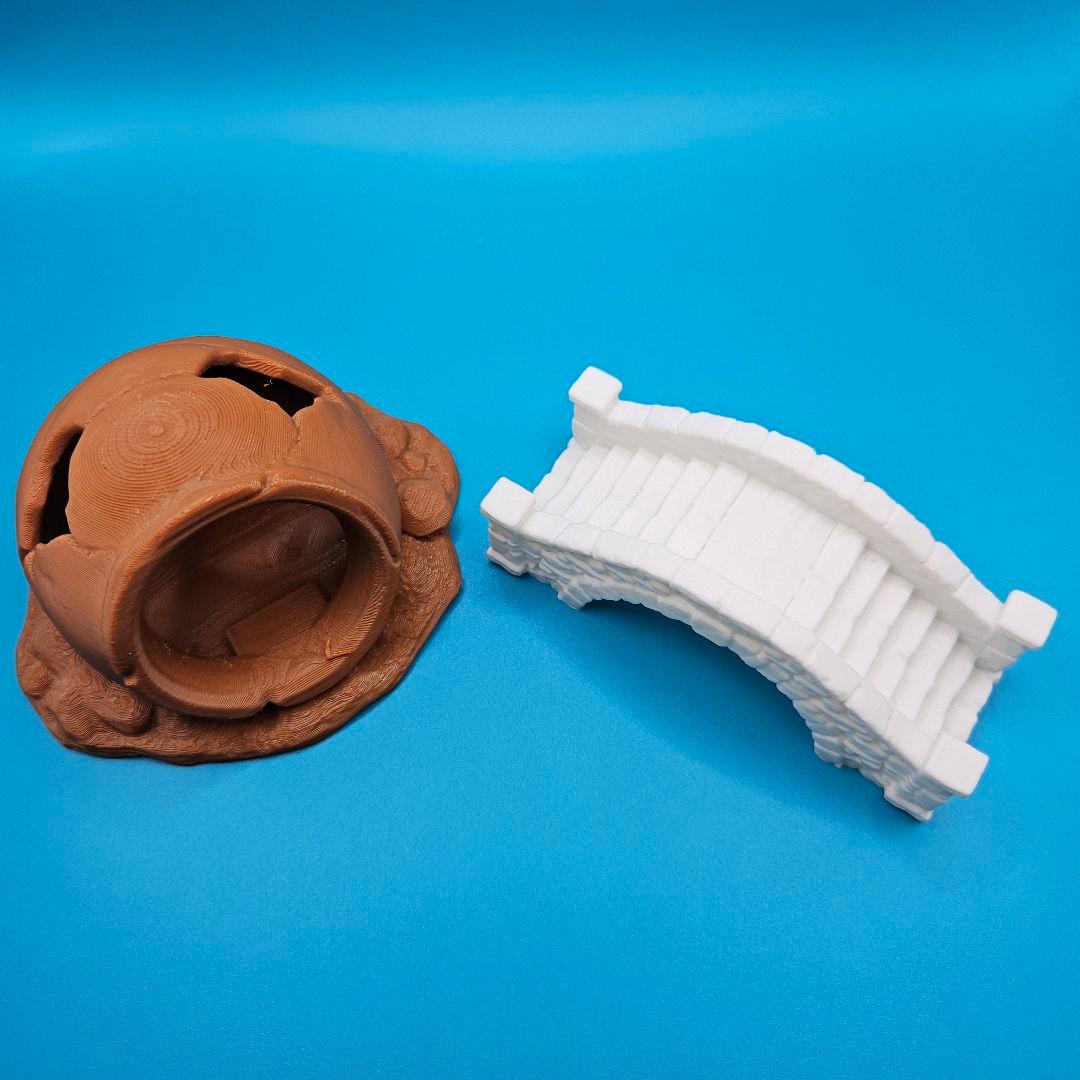 水底に沈められた古い壺をイメージしたオブジェと、レトロな石橋を組み合わせた水槽用オーナメントの2点セットです。3Dプリントで製作しており、生体の隠れ家や美しい水草レイアウトの土台として幅広く活躍します。